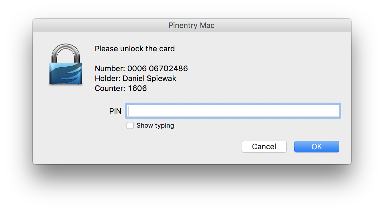 before_script: gpg --import key.ascDo NOT use your personal GPG key for CI signing! Ever. Your personal private key should never leave your laptop. In fact, it probably shouldn't be on your laptop at all. Strongly consider YubiKey or similar. Never, ever enter the decryption password (or smartcard PIN) for your private key into anything other than pinentry on your local machine. If you're using MacGPG (which you should be, if using macOS), this dialog will look similar to the following: