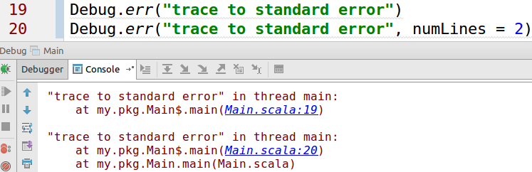 libraryDependencies += "com.github.johnreedlol" %% "scala-trace-debug" % "4.5.0"If you get: "NoClassDefFoundError: scala/reflect/runtime/package ... Caused by: java.lang.ClassNotFoundException"